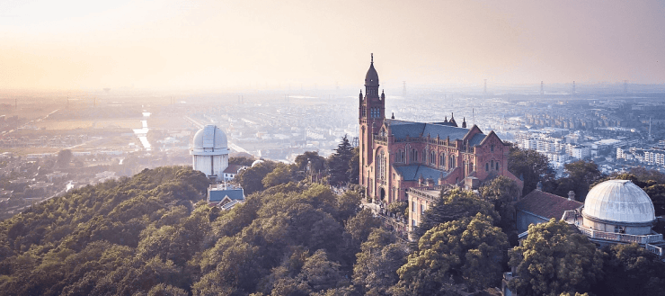 西佘山园现存1901年建成的佘山天文台(现上海天文博物馆)和1935年沉建的罗马式天从,